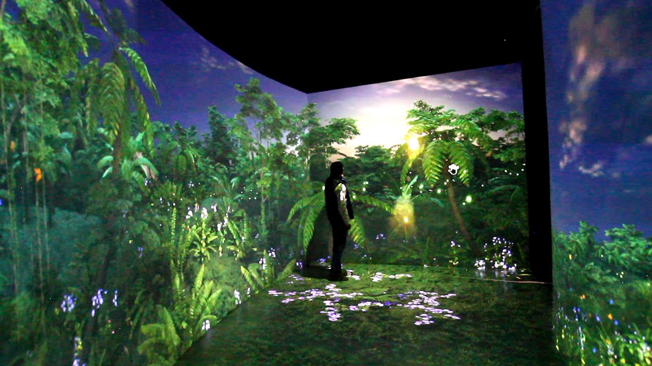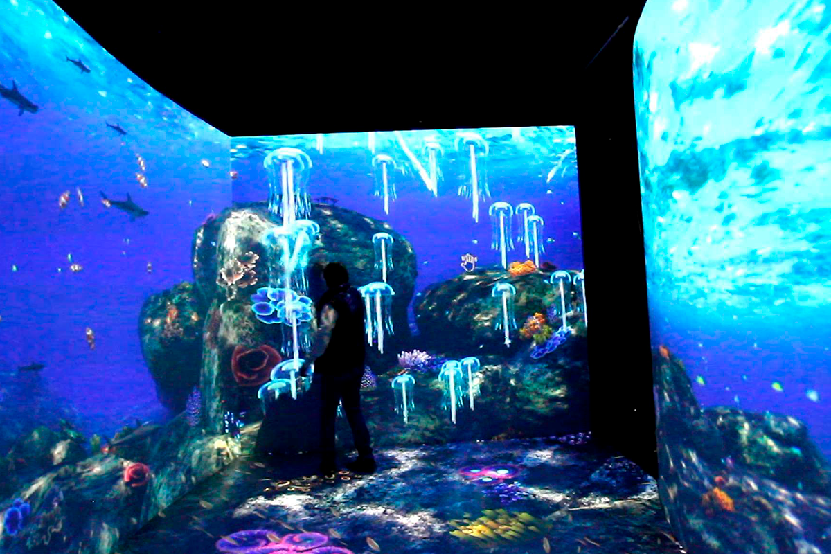 Allí, los visitantes exploran escenarios como la fauna marina de Galápagos o la selva amazónica, con contenidos generados en tiempo real mediante Unreal Engine y respuestas interactivas basadas en sensores LIDAR, que detectan los movimientos del público para provocar reacciones como peces que se espantan, medusas que reaccionan o flores que nacen.