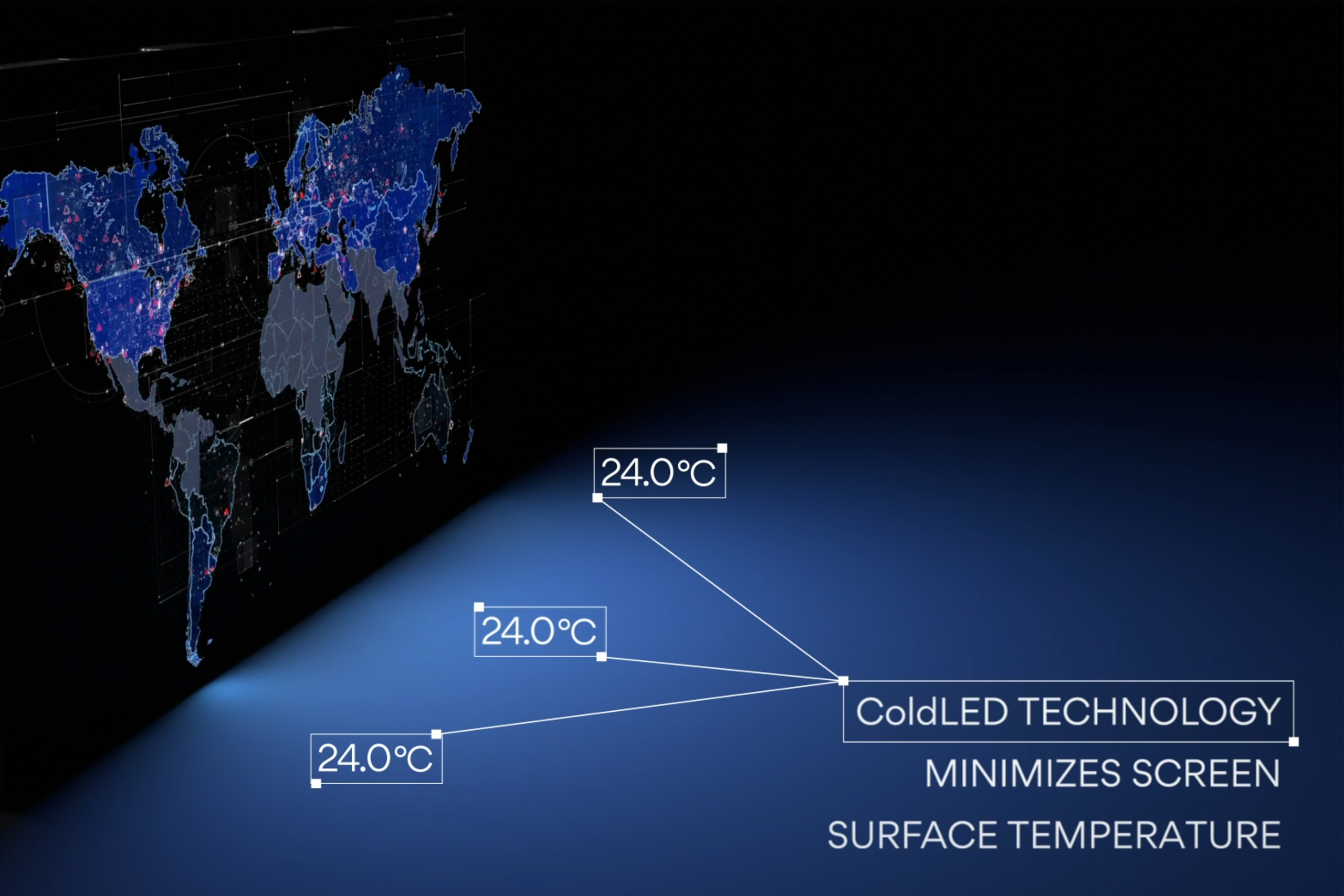 ColdLED integra diodos flip-chip, controladores IC de alta eficiencia y una arquitectura interna optimizada para ofrecer un sistema LED con refrigeración pasiva real. Gracias a esta combinación, las pantallas generan menos calor y eliminan la necesidad de ventiladores o mecanismos de disipación activa, lo que permite su integración en espacios cerrados o silenciosos sin afectar el entorno térmico o acústico.