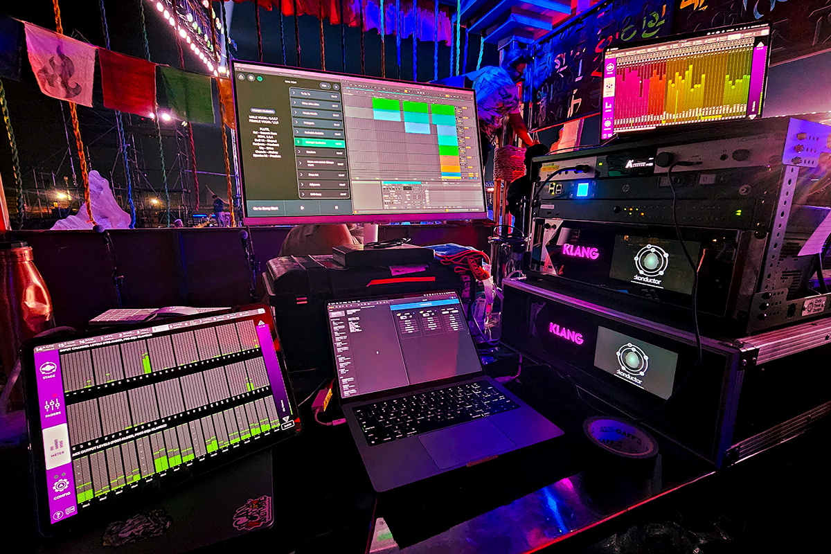 El ingeniero de monitores Anu Charan se encargó de gestionar más de 24 mezclas de IEMs además de 12 wedges y side fills, apoyándose en las capacidades inmersivas de KLANG para simplificar la operación. “El programa requería cuatro días de ensayos y un seguimiento continuo. La mínima fatiga auditiva proporcionada por las mezclas inmersivas de KLANG fue fundamental para mantener la energía de los intérpretes y del equipo técnico durante toda la noche”, concluye Cheruku.