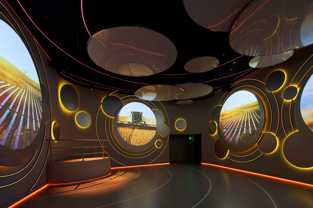 El sistema reproduce contenidos mediante un servidor AV Stumpfl PIXERA, que gestiona un bucle audiovisual de alta resolución con paisajes emblemáticos de EE. UU., secuencias de exploración espacial y partidos de béisbol, sumergiendo a los visitantes en una historia que refleja la innovación, la cultura y los logros estadounidenses.