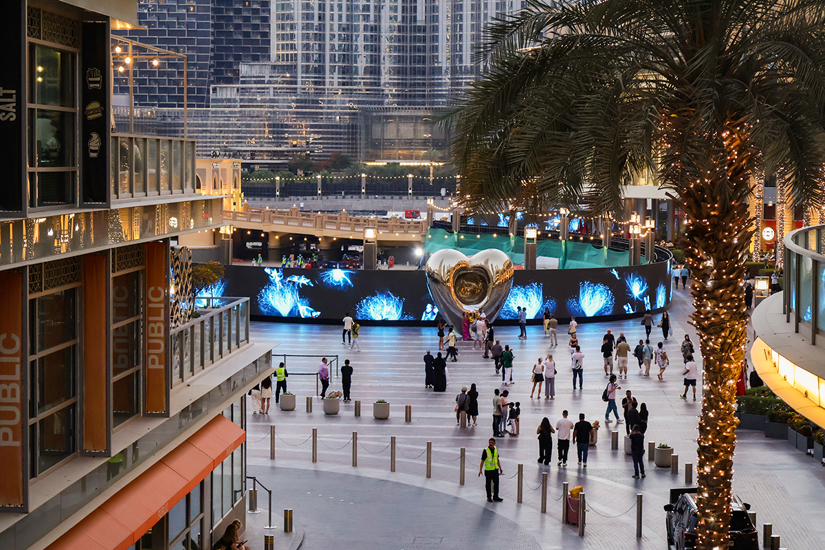 Este proyecto fue desarrollado junto a la integradora local Blue Rhine Industries por encargo de Emaar, con el objetivo de mantener la identidad visual del lugar durante los seis meses de trabajos. El sistema fue diseñado, fabricado e instalado en menos de 60 días, marcando un nuevo hito en el sector AV de gran formato.