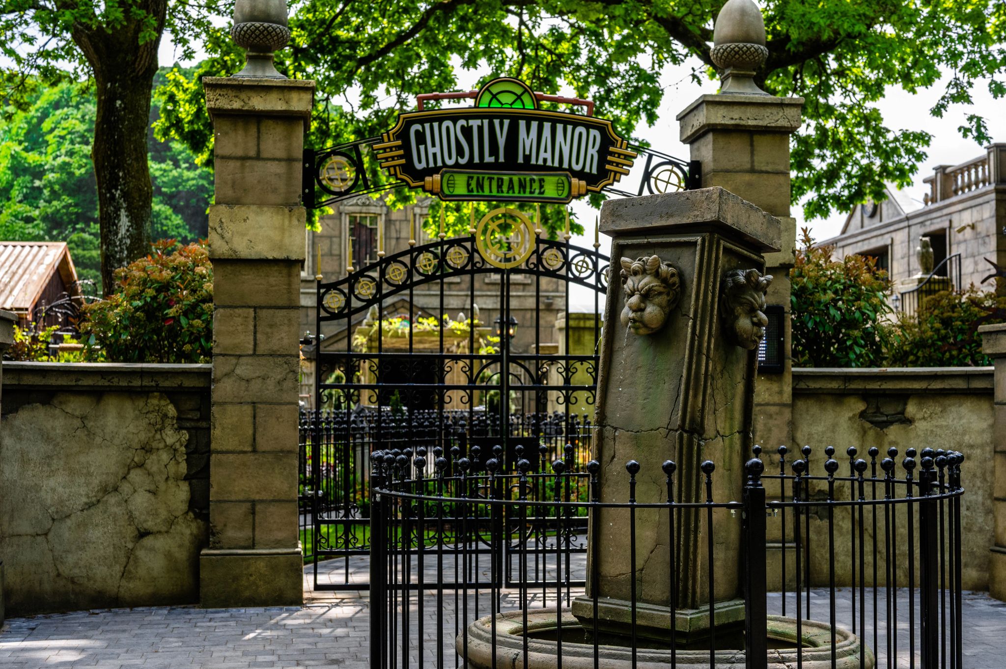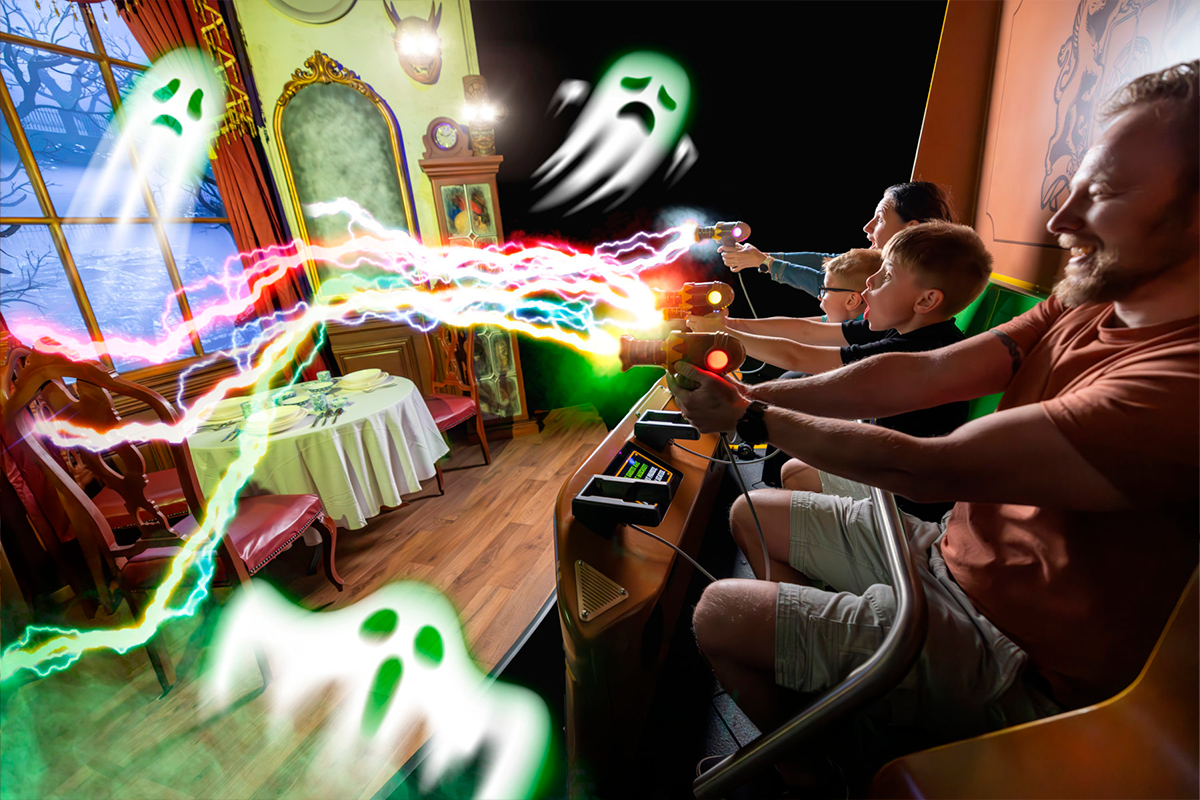Ghostly Manor utiliza un nuevo formato de atracción, Gameplay Theater, creado por Mack Rides y Lagotronics Projects. Vehículos que rotan de manera continua, con capacidad para ocho pasajeros sentados espalda con espalda, van descubriendo nuevos entornos en cada giro. Los visitantes disponen de Phantom Phasers, pistolas interactivas integradas en el vehículo, que les permiten atrapar fantasmas a lo largo de ocho escenas únicas. El formato ofrece un alto flujo de visitantes en un espacio circular reducido, optimizando la eficiencia y disminuyendo las colas. La experiencia concluye con una escena de puntuación que muestra el rendimiento de cada jugador junto con sus fotografías.