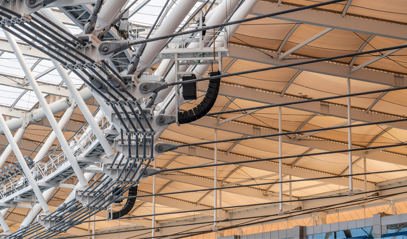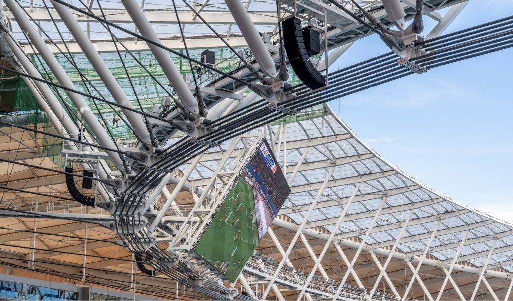 Las condiciones de instalación supusieron un reto técnico significativo debido a la geometría de la cubierta y a las limitaciones de acceso de la pasarela técnica bajo techo, lo que exigió soluciones de rigging compatibles con puntos de anclaje estructurales predefinidos y una ventana de ejecución especialmente reducida. El Engineering Support Group de RCF participó activamente en el diseño del sistema, el commissioning y la verificación de prestaciones, incluyendo validaciones acústicas con instrumentación calibrada y mediciones de inteligibilidad alineadas con metodologías IEC.