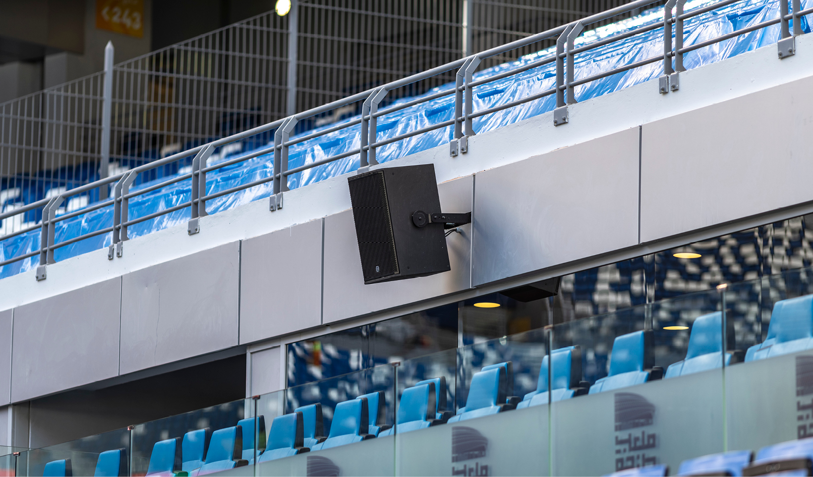 La cobertura de las áreas bajo graderío y de los sectores inferiores de la tribuna se resuelve mediante 96 altavoces P 4228 y 36 unidades COMPACT C 45 WP, garantizando una distribución homogénea del nivel sonoro y una elevada inteligibilidad en todo el recinto.