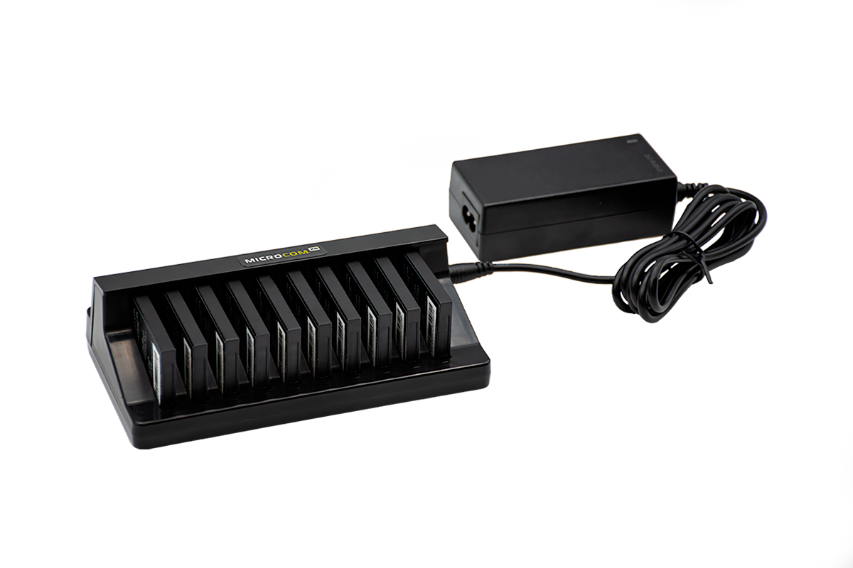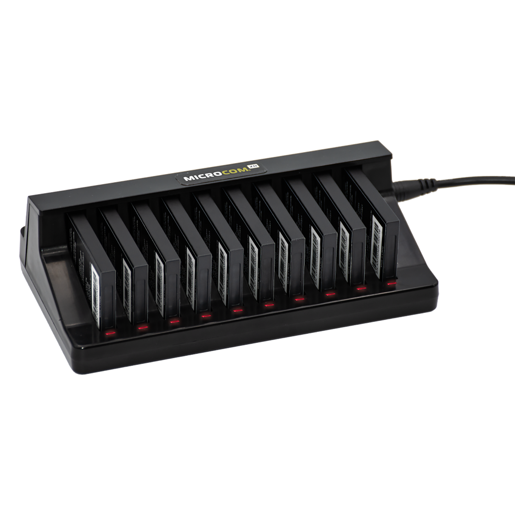 En el ámbito de alimentación, Pliant introduce un cargador de baterías independiente de 10 posiciones para el sistema MicroCom XR. Este dispositivo permite la carga simultánea de hasta diez baterías de auriculares All-In-One, proporcionando una solución eficiente para equipos de gran tamaño que requieren ciclos de carga rápidos y organizados.